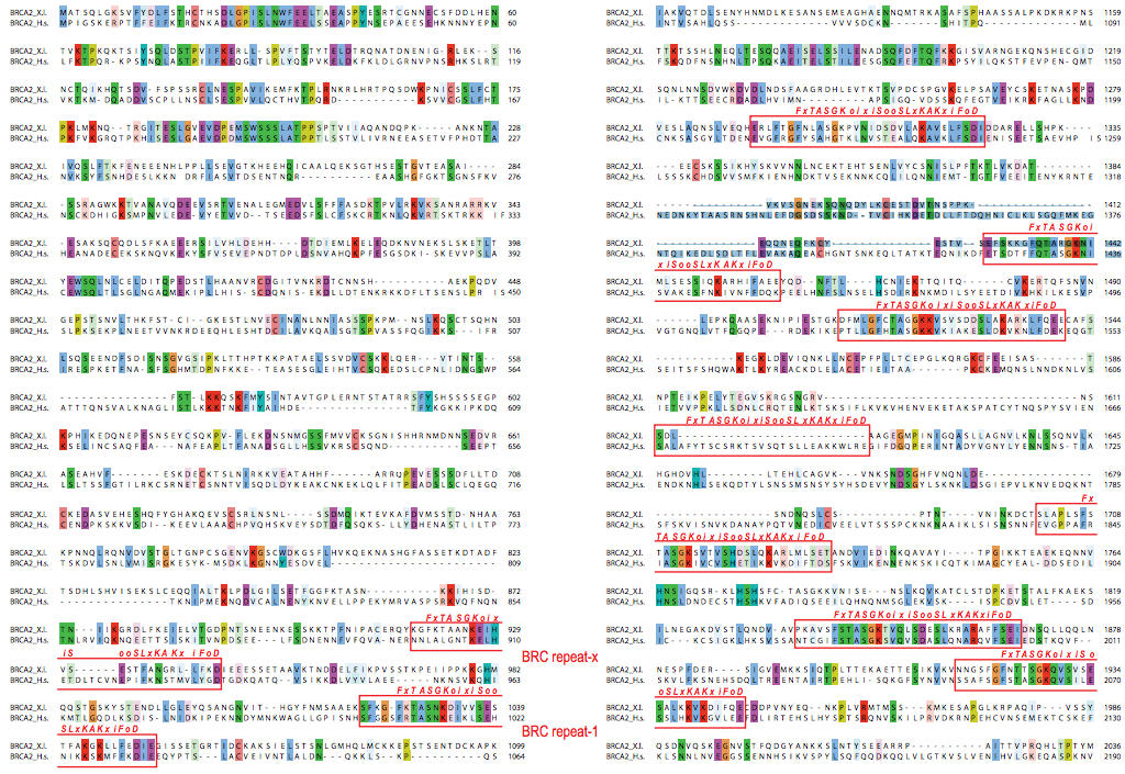 Analisi della proteine BRCA2 rispettivamente in cellule di anfibio Xenopus (X)  e in cellule umane (H): la colorazione evidenzia gli aminoacidi  importanti coinvolti nelle regioni geniche conservate tra le due specie e in cui BRCA2 risulta frequentemente alterato.