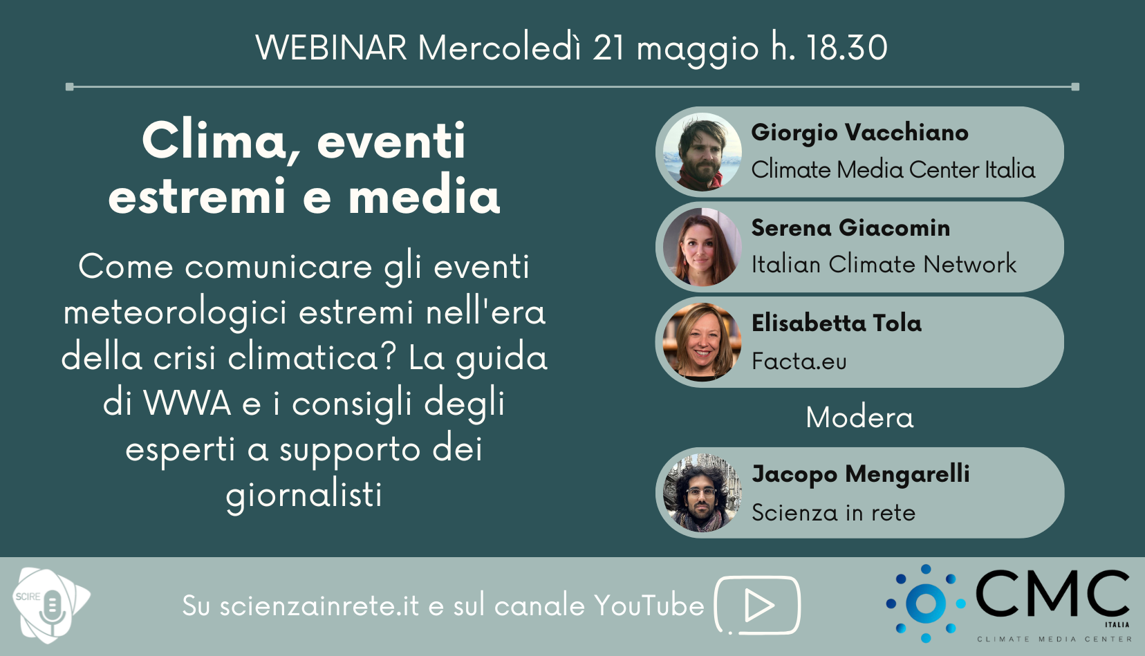 Mercoledì 21 maggio alle 18.30 webinar di Climate Media Center Italia e Scienza in rete su Clima, eventi estremi e media. Come comunicare gli eventi meteorologici estremi nell’era della crisi climatica? La guida redatta dagli esperti di World Weather Attribution (WWA), tradotta in italiano da Climate Media Center Italia (CMC Italia), dà una serie di consigli ai giornalisti. Ne discutono Giorgio Vacchiano (presidente CMC Italia, docente ecologia forestale Unimi), Serena Giacomin (direttrice scientifica Italian Climate Network), Elisabetta Tola (presidente Facta.eu, caporedattrice Il Bo Live e voce Radio3Scienza), moderati da Jacopo Mengarelli (Scienza in rete). Il webinar, gratuito, si può seguire sul sito e sul canale YouTube di Scienza in rete, con la possibilità di porre domande e partecipare con osservazioni e commenti.