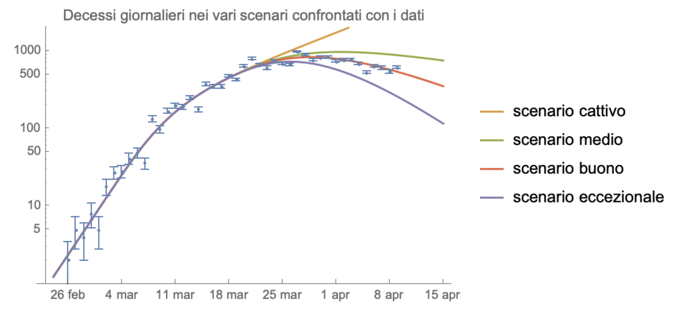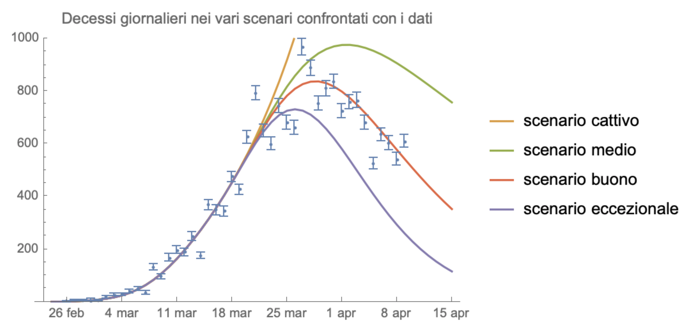 Si vede chiaramente che i quattro scenari che abbiamo analizzato cominciano a prevedere comportamenti abbastanza differenti solo a partire dal 23 marzo. Nel primo scenario, quello cattivo, il numero dei decessi continua a salire tranquillamente senza deflettere, e avrebbe superato i 2000 decessi al giorno una settimana fa (per fortuna questo scenario non si è realizzato grazie alle misure restrittive adottate!). Nel secondo scenario, quello medio, i decessi si arrestano un po’ sotto i mille e cominciano a scendere molto lentamente arrivando a 900 decessi al giorno per Pasqua. Il terzo scenario, quello buono, ha il comportamento più simile a quello dei decessi osservati, mentre il quarto scenario, quello eccezionale, prevede una decrescita più rapida di quella misurata.
