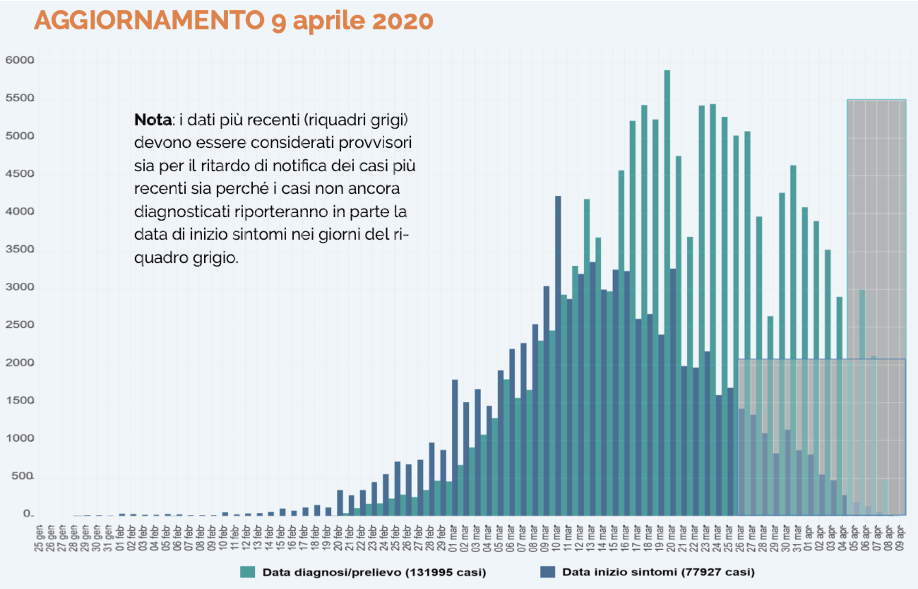 Figura 5. Data in cui i pazienti trovati hanno registrato i primi sintomi e data di diagnosi. Bollettino ISS 9 aprile 2020.