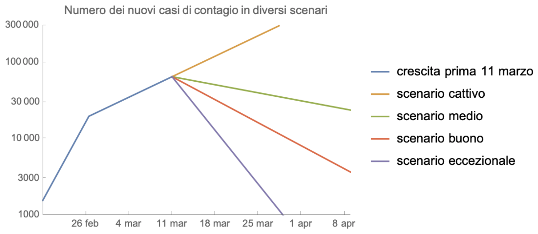 All’interno di questo modello matematico analizziamo in primo luogo l’evoluzione dei contagi, costruendo quattro diversi scenari che differiscono tra di loro nella valutazione degli effetti delle misure prese l’undici marzo. Per fare questo partiamo da un’ipotesi ragionevole sul comportamento che il numero dei contagi ha tenuto prima dell’undici marzo, assumendo una crescita impetuosa fino all’adozione delle prime misure restrittive nelle zone rosse (ultima settimana di febbraio) e un successivo rallentamento della crescita. Questo rallentamento nella realtà potrebbe essere avvenuto in maniera più graduale, visto che i provvedimenti del governo in quei giorni sono stati molti e di portata crescente. Tuttavia, ai fini dell’analisi degli effetti delle misure restrittive dell'undici marzo, approssimare il rallentamento precedente con un solo cambiamento significativo non incide sensibilmente sui risultati. Quindi nel periodo precedente alla data dell’undici marzo fissiamo i parametri del modello ai valori che meglio descrivono i dati: una crescita esponenziale con tempo di raddoppio poco superiore ai 2 giorni fino al 26-27 febbraio e a seguire una crescita esponenziale con tempo di raddoppio intorno alla settimana.