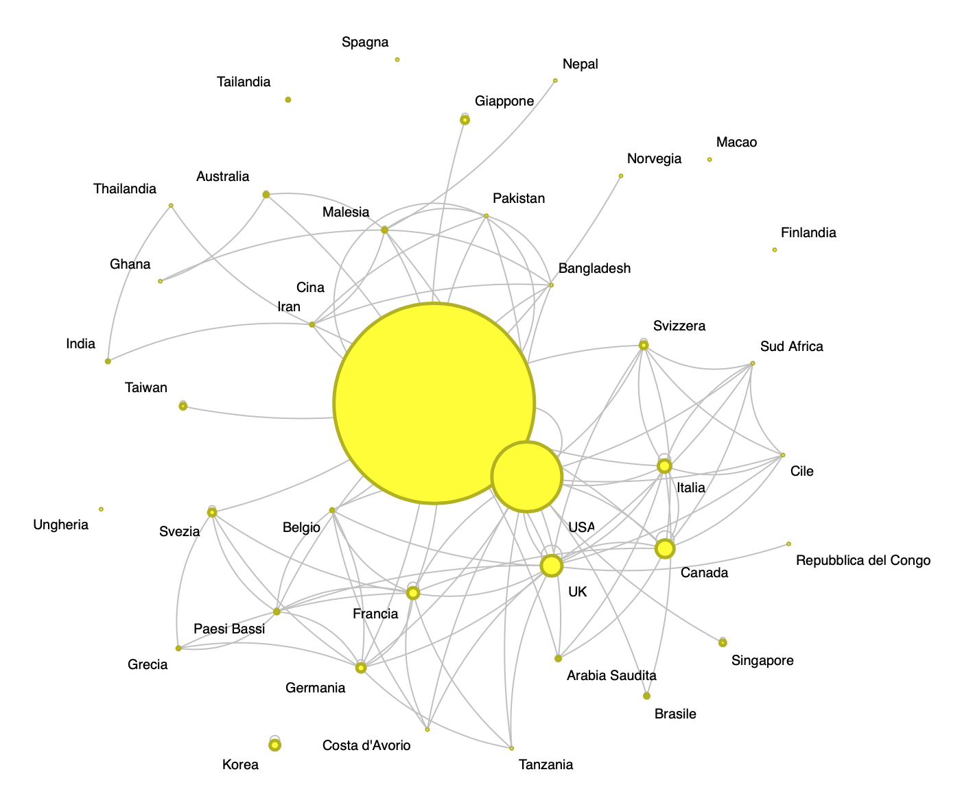 Rete delle collaborazioni degli enti di ricerca per paese creata in base alle affiliazioni delle pubblicazioni scientifiche analizzate. Il numero di partecipazioni alle pubblicazioni per ciascun paese determina la dimensione dei nodi.