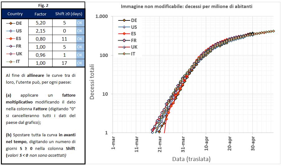 Invitiamo a questo punto il lettore ad esplorare personalmente l’interattività del grafico. Applicando le operazioni di cui sopra, ovvero scegliendo nella tabella di controllo i parametri giusti per ogni paese, ed escluse le fasi iniziali, possiamo portare tutte le curve ad un buon livello di sovrapposizione, con una accuratezza sorprendente. I parametri giusti e il risultato finale sono riportati nella figura 2.