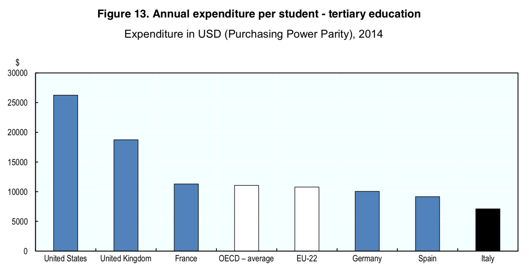Quali sono le cause di questa così marcata diversità di preparazione? La figura 13 ci fornisce non “la” risposta, ma certo individua uno dei fattori determinanti. L’investimento in formazione. La spesa per studente nell’università italiana è la metà della media europea e OECD, meno di un terzo di quella nel Regno Unito e più o meno un quinto di quella negli Stati Uniti.