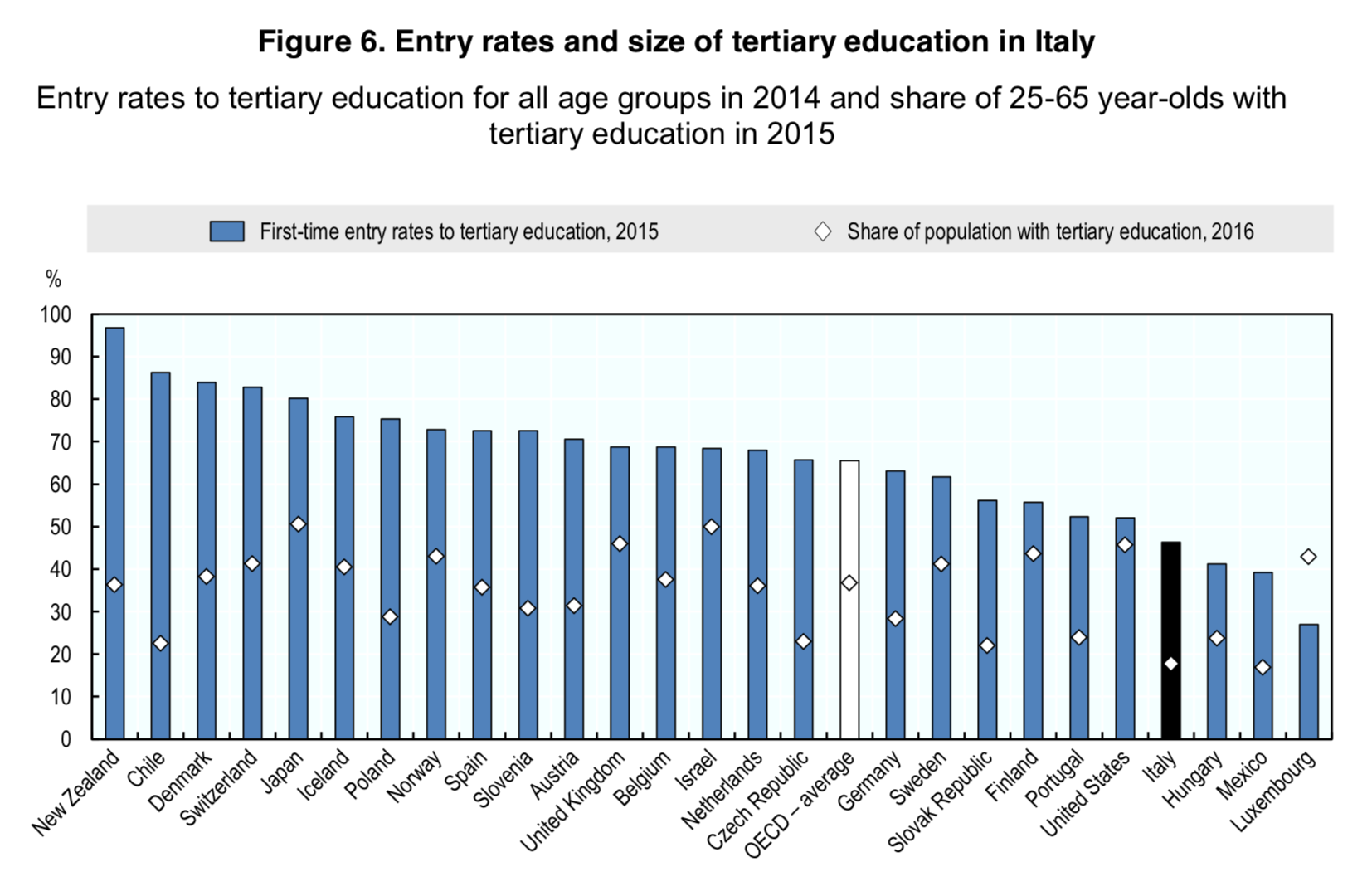 Ma, prima ancora della qualità, un dato fondamentale riguarda la quantità della “Tertiary Education”. La Figura 6 del rapporto OECD mostra che meno del 20% della popolazione italiana in età da lavoro ha una laurea, contro una media OECD che è esattamente doppia (40%). In alcuni paesi, come Giappone e Stati Uniti, più della metà della popolazione di età compresa tra i 25 e i 65 anni è laureato. È questo il grande gap italiano. Nel nostro paese i laureati sono troppo pochi.