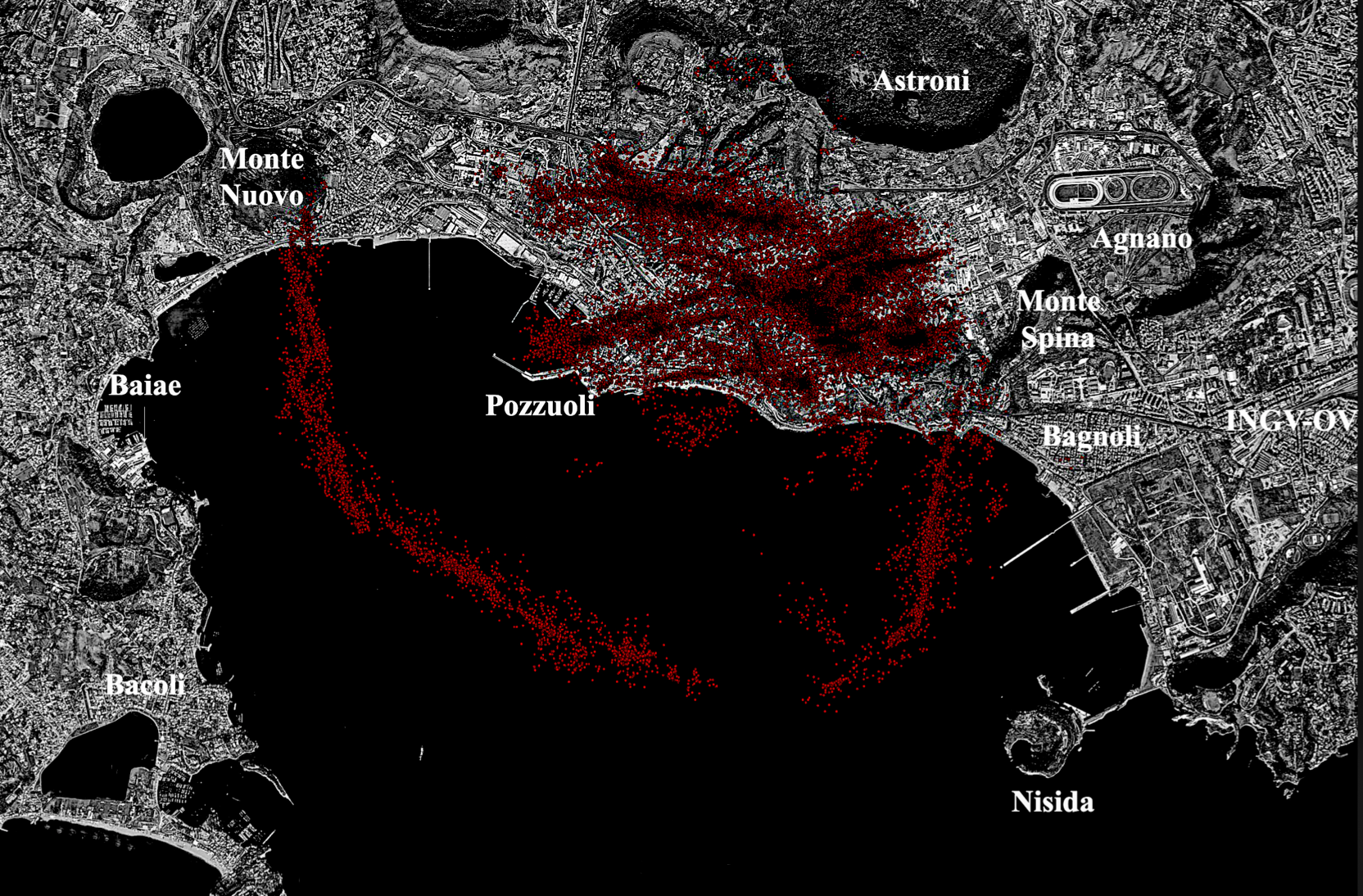 L'immagine mostra i terremoti che si sono verificati nell'intera caldera dei Campi Flegrei, circa 11 chilometri a ovest del centro di Napoli, dal 2022 al 2025, sovrapposti alle immagini satellitari di Google Earth. Credit: Xing Tan (Stanford University).