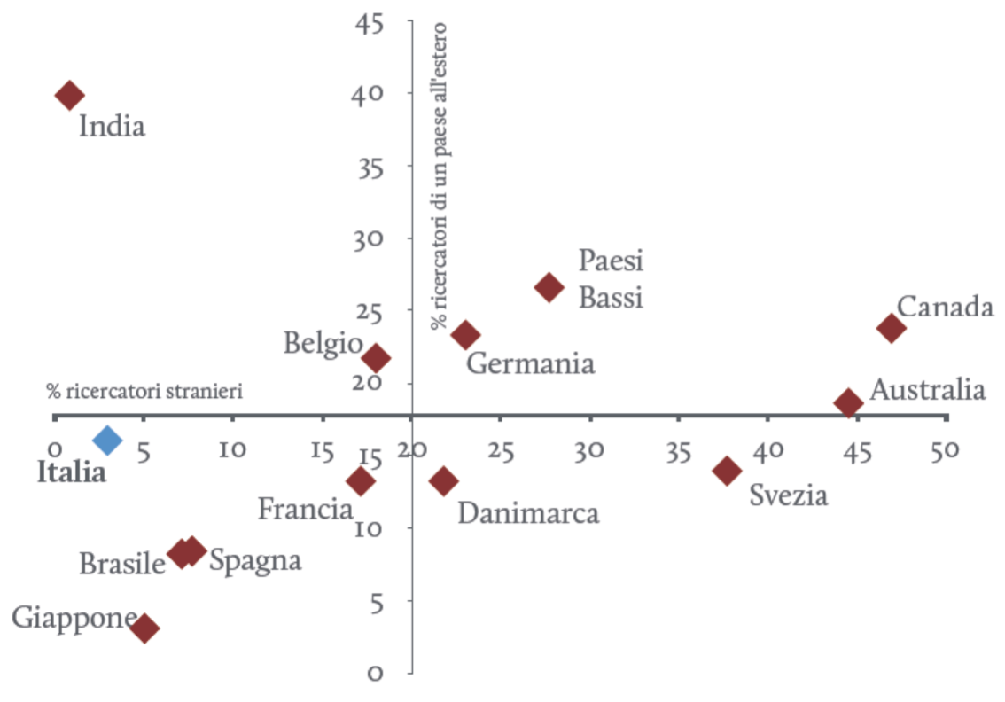 Com’è noto, purtroppo, l’Italia non è generalmente un paese capace di attrarre ricercatori dall'estero, piuttosto li esporta. Riportiamo un grafico che focalizza l’attenzione sullo sbilanciamento fra brain drain e brain gain. Quello che ci preoccupa dell'Italia non è la cosiddetta "fuga dei cervelli". È infatti auspicabile che i ricercatori ben formati in Italia, dotati per altro di riconoscimenti anche sul piano internazionale, facciano esperienza all’estero. Tuttavia, sarebbe altrettanto desiderabile che un analogo numero di persone venga a fare ricerca nel nostro paese. Purtroppo, invece, se guardiamo il saldo fra ricercatori che entrano ed escono dal paese, vediamo che l’Italia è mal posizionata. Il saldo è ampiamente negativo, comparabile a quello dell’India.