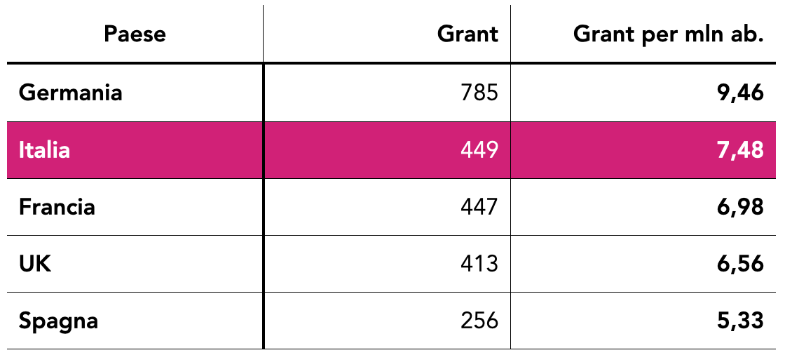 Se si guarda, però, alla classifica dei ricercatori vincitori di grant per nazionalità, ci posizioniamo molto meglio, allo stesso livello di Francia e Regno Unito e subito dietro la Germania. Il risultato dei ricercatori italiani è particolarmente buono per gli Starting Grant e i Consolidator Grant, su cui abbiamo addirittura superato la Germania nel 2020, mentre per gli Advanced Grant siamo più indietro.