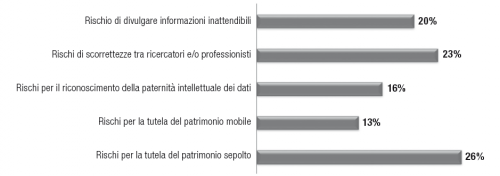 La mancanza di una corretta conoscenza dell’argomento sembra uno degli elementi che concorrono a creare diffidenza, generando l’errata idea che il dato aperto sia un dato indifeso, alla mercé di qualunque tipo di manipolazione, tanto che circa un quarto degli archeologi1 pensa che gli open data non siano tutelati da licenze d’uso. È quindi elevato il timore di essere privati del risultato del proprio lavoro, che si traduce nel non rendere noti i dati, se non in forma molto generica e sommaria, fino al momento della pubblicazione integrale dei risultati della ricerca.