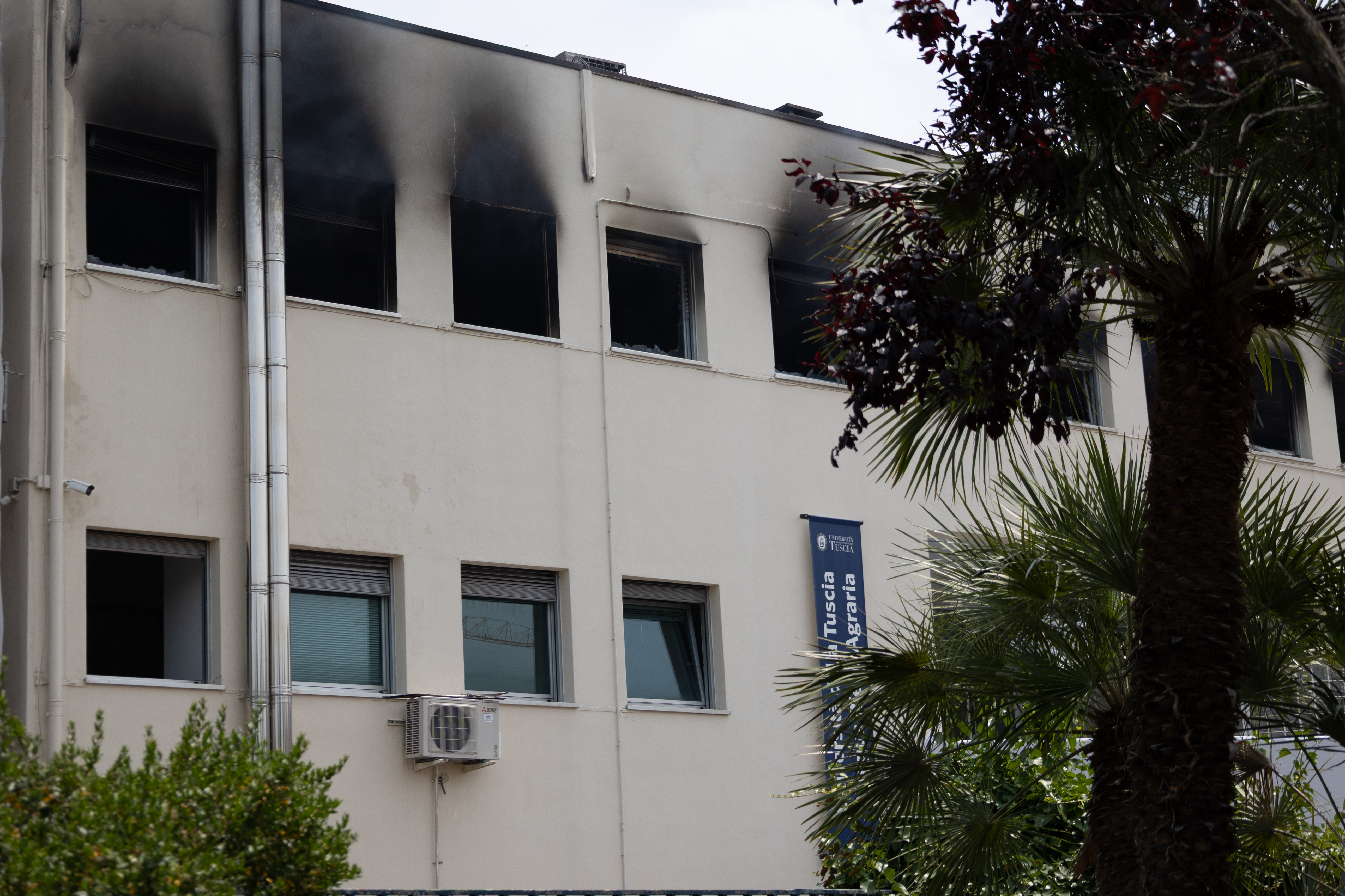 Due immagini della facoltà di Agraria dell'Università della Tuscia all'indomani dell'incendio