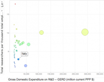 Serie storica dal 1981 al 2012 della spesa in R&S e numero di ricercatori ogmi mille lavoratori