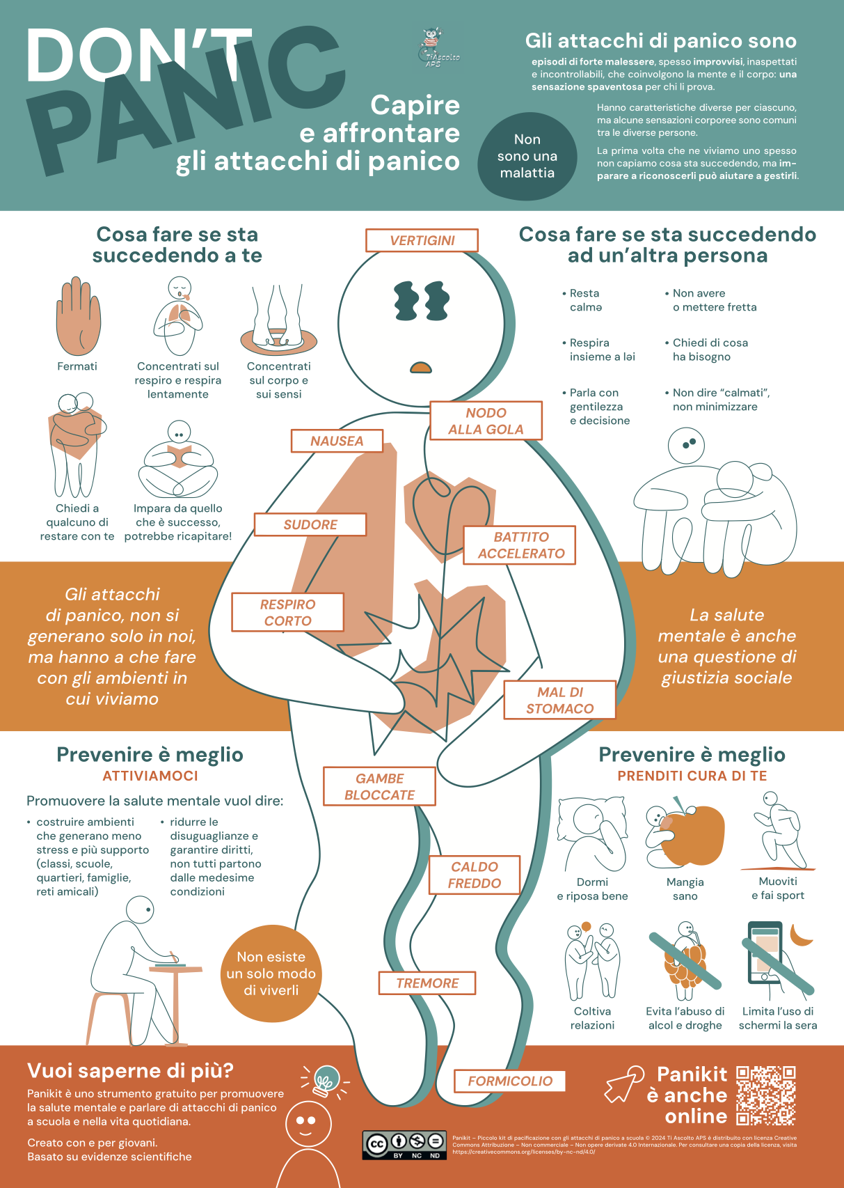 Panikit è un opuscolo pieghevole, gratuito e disponibile anche online, pensato per ragazze e ragazzi delle scuole superiori ma utilizzabile anche da insegnanti e adulti di riferimento. Non è un manuale clinico, né una guida all’autodiagnosi. Prova a rispondere a domande concrete: che cosa mi sta succedendo? perché il corpo reagisce così? che cosa posso fare quando arriva il panico, per me o per un’altra persona? Contiene spiegazioni di base su ansia e attacchi di panico, suggerimenti pratici per affrontare una crisi, indicazioni su come aiutare chi sta vivendo un momento di difficoltà, e alcuni spunti di prevenzione. Il linguaggio è intenzionalmente non patologizzante, lontano dal gergo specialistico e dalla semplificazione rassicurante.