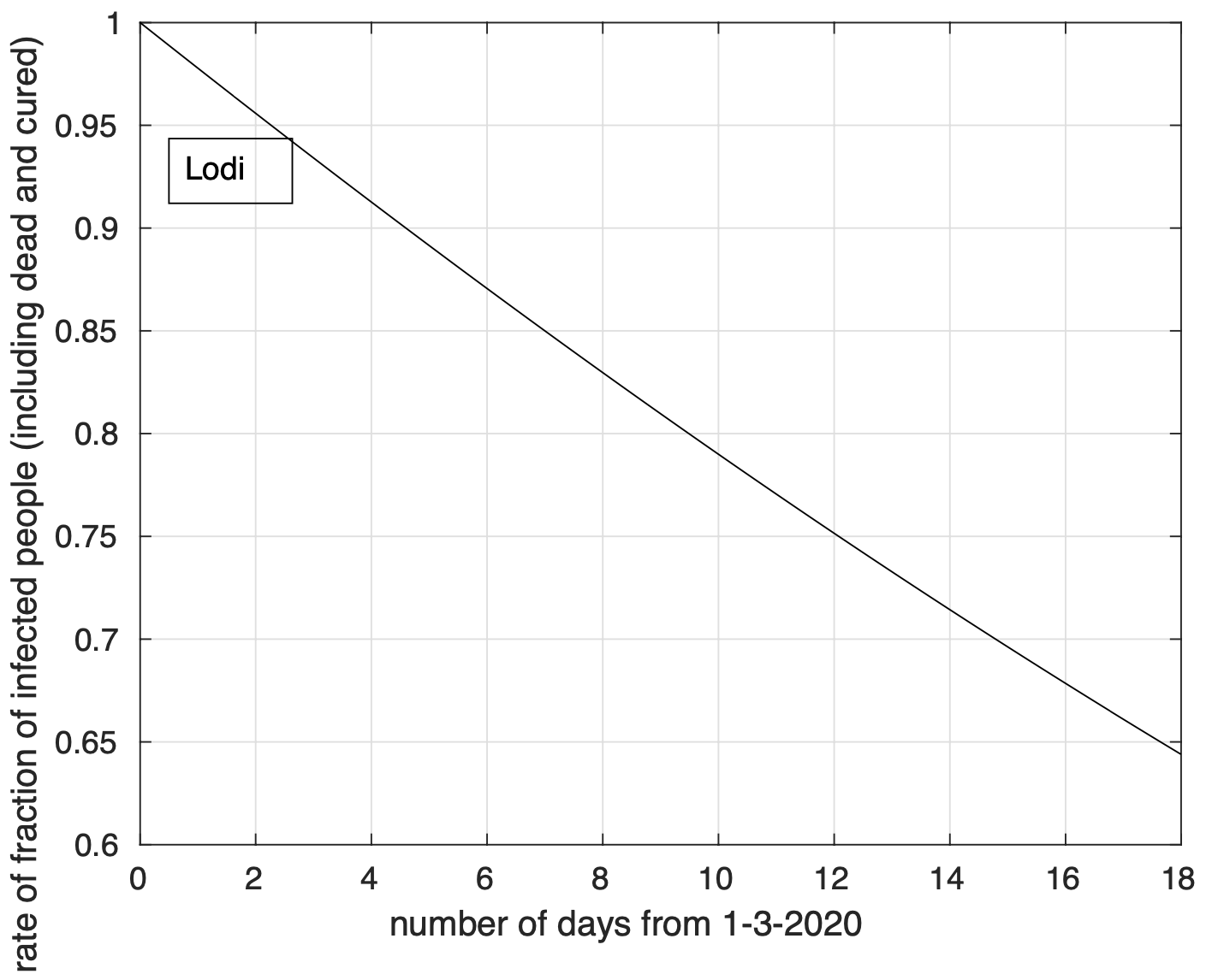 Figura 11. Tasso di crescita della frazione del numero di contagiati osservati a Milano rispetto alla popolazione della regione in funzione del tempo a partire dal 1 marzo. Il modello teorico adottato è quello doppio logistico.