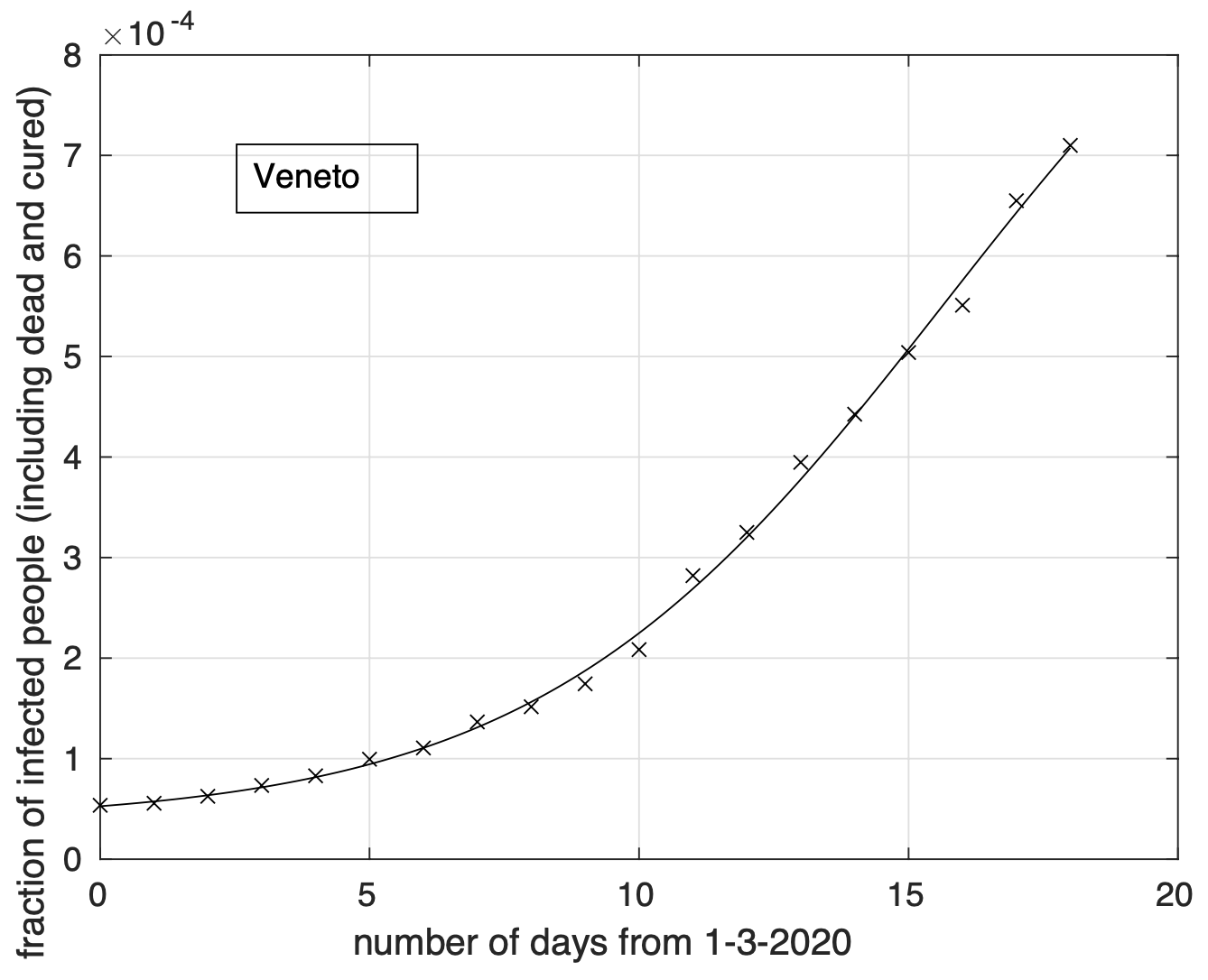 Figura 3. Frazione del numero di contagiati osservati nel Veneto rispetto alla popolazione della regione in funzione del tempo a partire dal 1 marzo. Il miglior fit con un modello logistico è sovrapposto ai dati.