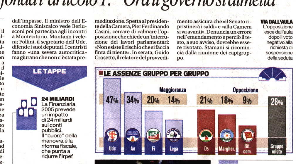 In fig. 6 La Repubblica (10/11/2004, pag. 2) presenta la percentuale di assenze dalle sedute della Camera dei Deputati per ognuno dei partiti sia della maggioranza sia dell’opposizione. Le barre, in basso, iniziano con un prolungamento di colore più scuro, senza soluzione di continuità e tra la parte inferiore e quella superiore viene aggiunto il simbolo del partito rappresentato. L’occhio percepisce queste barre verticali come un tutt’uno e pertanto i valori numerici sembrano in contraddizione con le altezze. Solo a una più attenta indagine si intuisce che la parte inferiore della barra non va presa in considerazione perché è portatrice di una deformazione rispetto ai dati numerici. La domanda che ci si pone, come spesso in questi casi, è: se l’informazione era più facile da rappresentare con dei semplici numeri, perché ricorrere a un grafico intrinsecamente fuorviante?