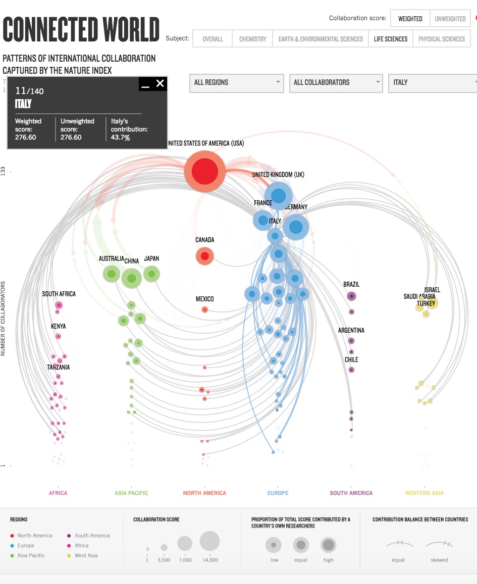 La rivista Nature ha pubblicato in questi giorni una piattaforma ricca di dati, navigabili in modo semplice e interattivo, che raccontano il mondo delle collaborazioni scientifiche fra i diversi paesi del mondo, proponendo una classifica delle 100 istituzioni più “virtuose” in questo senso, secondo il Nature Index, che misura le occorrenze delle affiliazioni degli autori di articoli pubblicati sulle 68 maggiori riviste scientifiche mondiali fra il 1 settembre 2015 e il 31 agosto 2016.