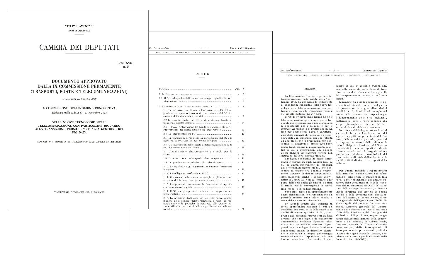 Alcune pagine del documento approvato a luglio 2020 dalla Commissione IX della Camera dei Deputati a conclusione dell'indagine conoscitiva su 5G e big data.
