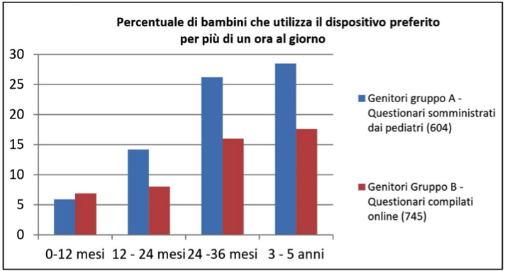 L'unico studio italiano sull'appropriazione digitale dei bambini al di sotto dei 5 anni di età è stato pubblicato nel 2016 dal Centro per la Salute del Bambino1. I dispositivi presenti nelle famiglie, preferiti dai bambini, sono il cellulare o lo smartphone dei genitori (35,5%) e il tablet (25,2%), utilizzato soprattutto dai 3 anni in poi. Questi due dispostivi hanno sostituito la televisione, che è preferita solo dal 18,6%, mentre i videogiochi (0,7%) e il computer (3,2%) restano ancora di uso molto limitato in questa fascia d’età.