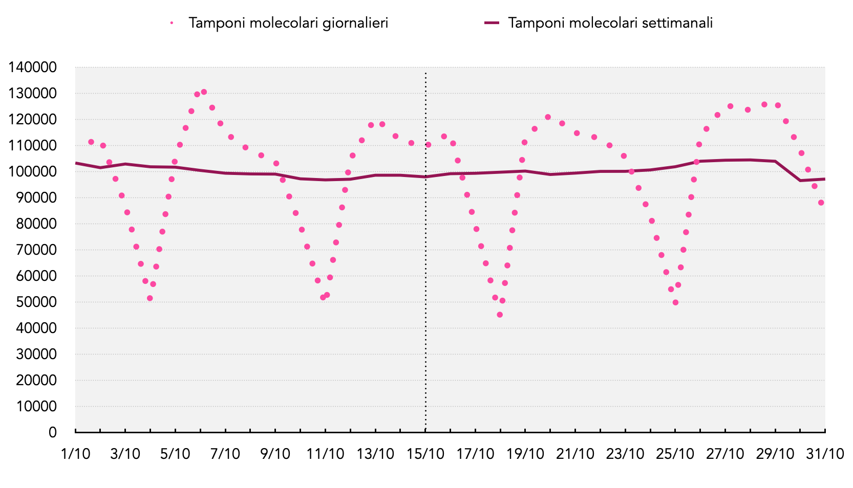 Si può osservare chiaramente come i tamponi molecolari non abbiano avuto variazioni di frequenze importanti mentre i tamponi antigenici, che a inizio mese erano attorno ai 180 000 sono esattamente raddoppiati da metà mese in poi. I contagi, infine, sono aumentati proprio a partire da metà mese. Si osservi anche che, mentre per contagi e tamponi molecolari si ha un ciclo settimanale costante con il minimo di lunedì, per i tamponi molecolari la variabilità è differente e non uniforme da una settimana all'altra. Si consideri infine che i dati calanti di fine mese dipendono anche dalla riduzione di attività diagnostica dovuta al ponte del 1° novembre.
