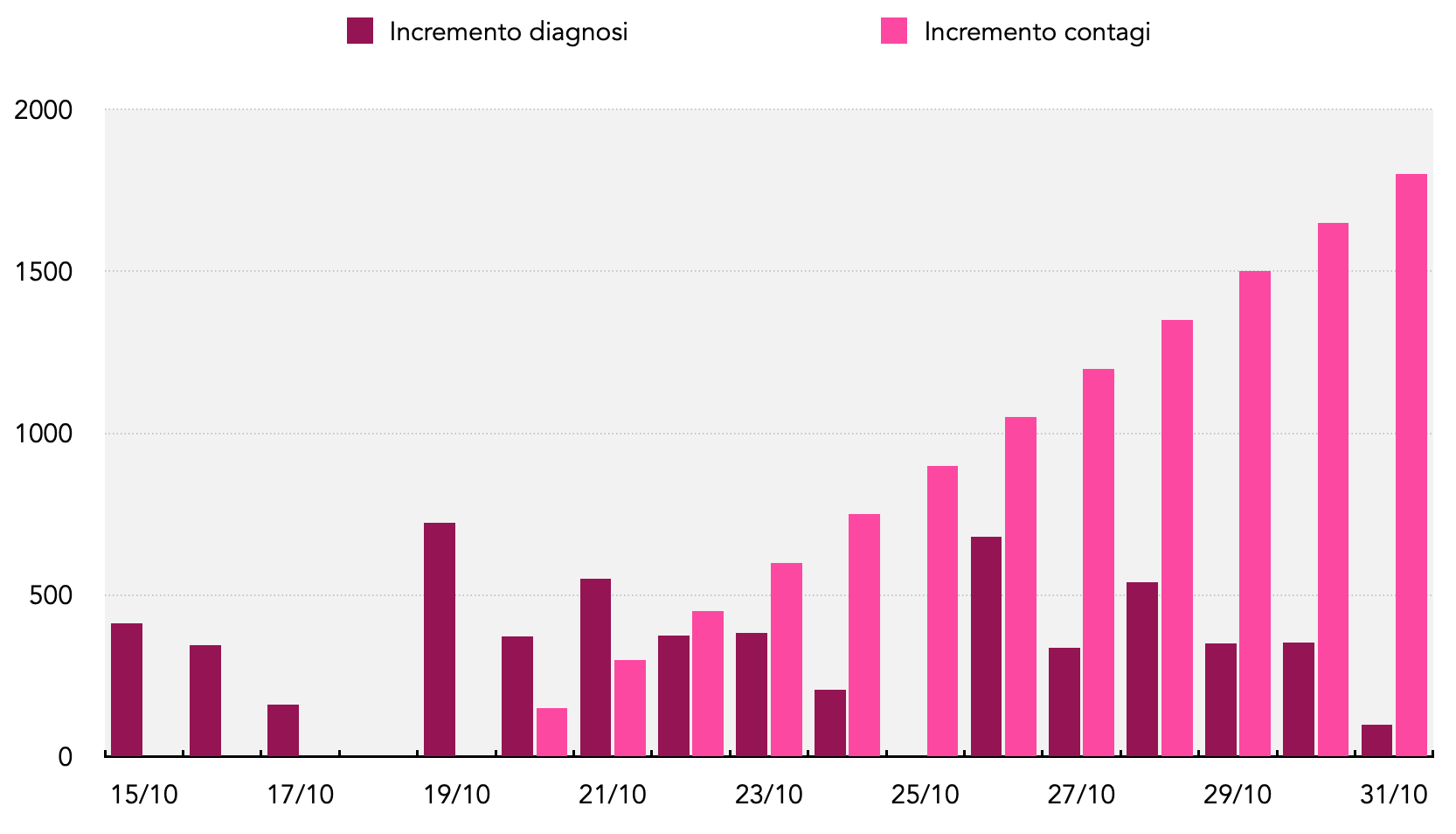 I casi positivi emersi grazie ai tamponi potrebbero essere lo 0,2% dei tamponi che superano la media precedente di circa 300 000: dal 15 al 31 ottobre questi potrebbero essere stati circa 6 000 casi. I nuovi contagi, invece, potrebbero aver iniziato il 20 ottobre ed essere aumentati di 100 casi al giorno e a fine mese sarebbero stati in totale circa 12 000. Se l'ipotesi è corretta, allora si capirebbe perché nella prima settimana di crescita era più evidente il ruolo delle diagnosi conseguenti ai tamponi rispetto alla aumentata contagiosità, perché all’inizio della seconda settimana i due fattori hanno avuto lo stesso peso e perché, successivamente, si è resa sempre più evidente la crescita della contagiosità.