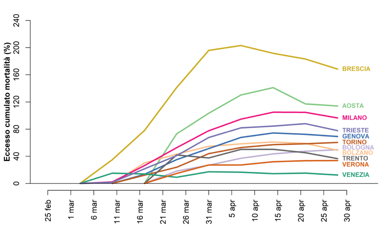 Tra le città del campione sono soprattutto Brescia, a Aosta e Milano a registrare gli scostamenti maggiori. A partire dalla prima settimana di aprile si osserva una flessione dell’incremento dei decessi con una tendenza a una riduzione o una stabilizzazione dei dati.