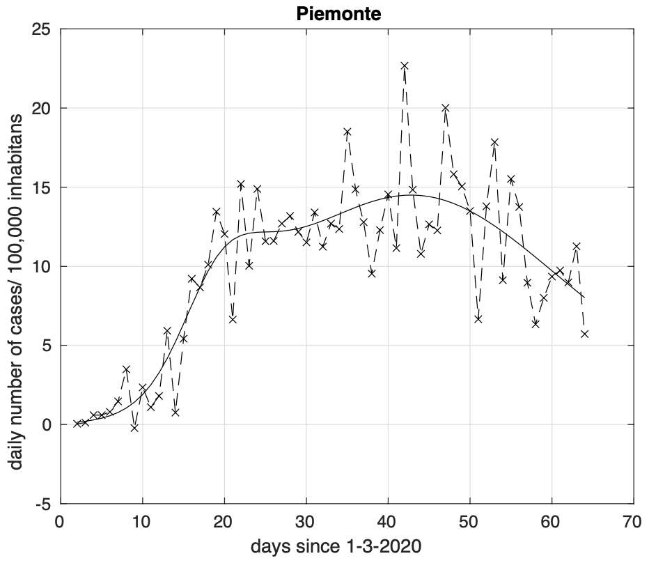 Figura 10. Sequenza del numero giornaliero di contagiati osservati in Piemonte. Il miglior fit con un modello logistico generalizzato (derivata) è sovrapposto ai dati.