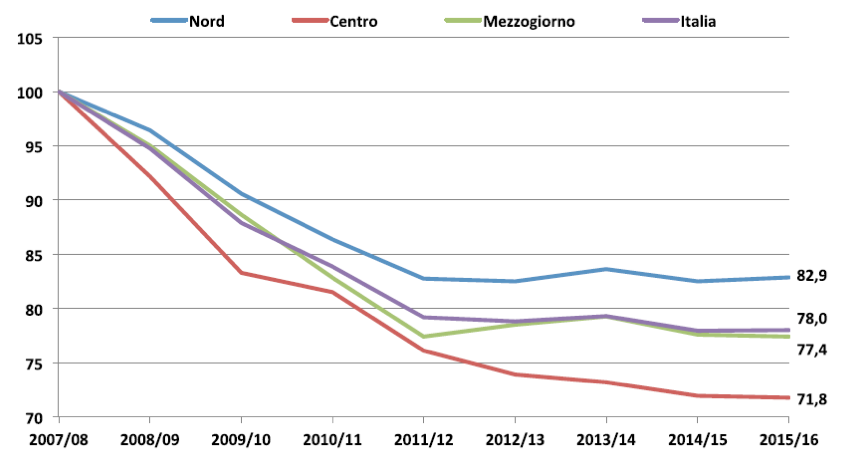 Tutto questo ha un riflesso sull’offerta didattica. I corsi sono diminuiti: dai 5.879 del 2007/2008 a 4586 del 2015/2016: un taglio del 22%. Più accentuato al Centro (-28%) e al Sud (-23%) che al Nord (-17%).