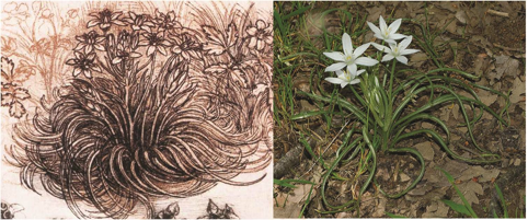 Disegno di Leonardo da Vinci, 1506 ca., Windsor, RL 12424 (a sinistra); Ornithogalum divergens Boreau (Asparagaceae), pianta molto comune sul Montalbano, fotografata sopra Castra (Capraia e Limite), il 3 Maggio 2008 (a destra)