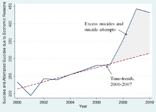 Poiché i suicidi sono un evento raro, per aumentare la precisione delle stime abbiamo considerato insieme suicidi e tentati suicidi (che seguivano un andamento simile) e, con le dovute elaborazioni statistiche, abbiamo osservato che i suicidi e tentati suicidi sono cresciuti ad un tasso di 10,2 suicidi l’anno prima della crisi finanziaria, ma dopo questo periodo la percentuale è salita a 53,9 suicidi l'anno. Abbiamo così stimato un numero di 290 suicidi e tentati suicidi in eccesso imputabili alla Grande Recessione.
