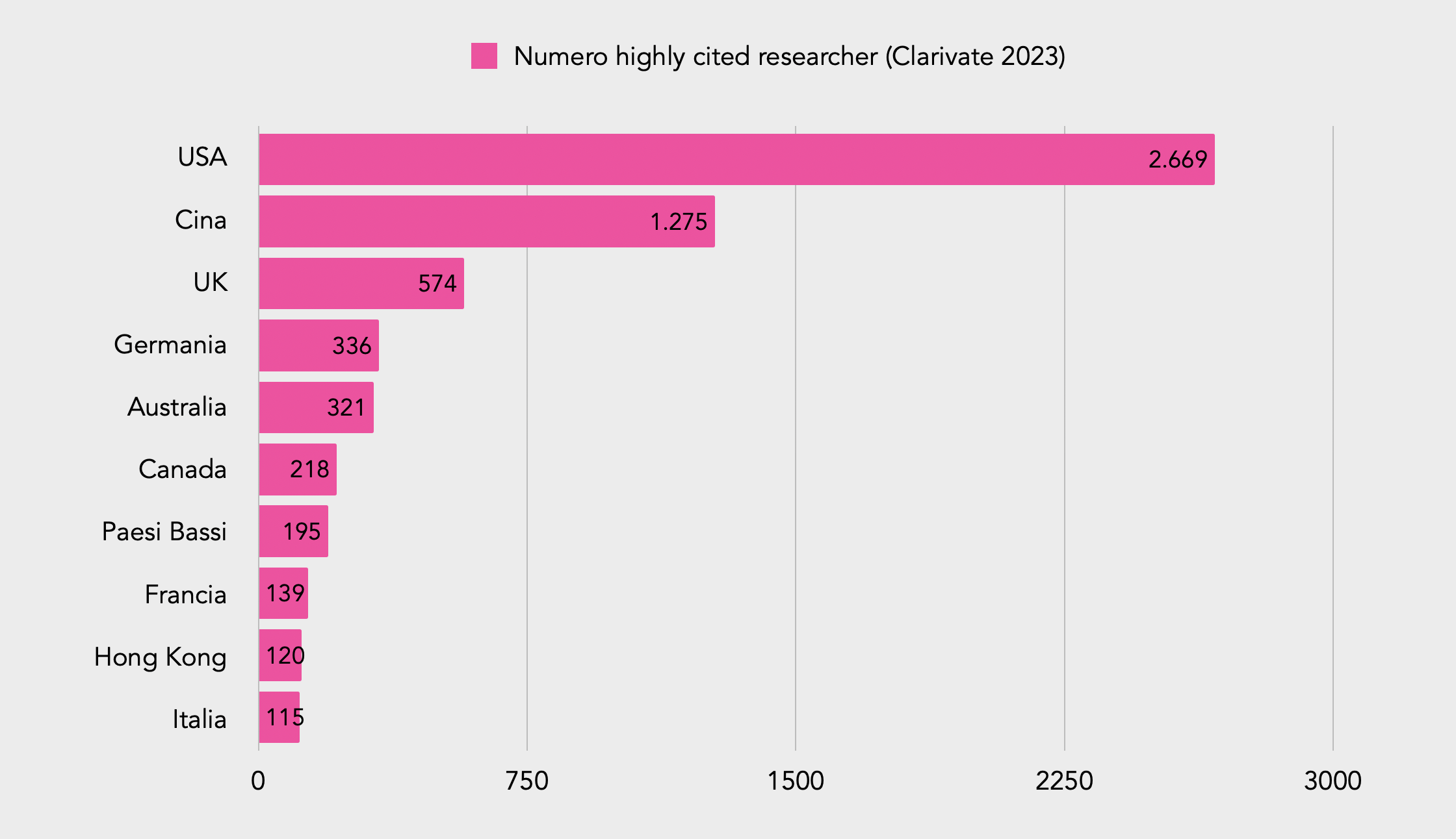 Nel 2023, l'elenco degli scienziati più citati riflette un panorama di ricerca per la gran parte concentrato in pochi paesi: l’80% degli “highly cited” sta in soli 10 paesi.