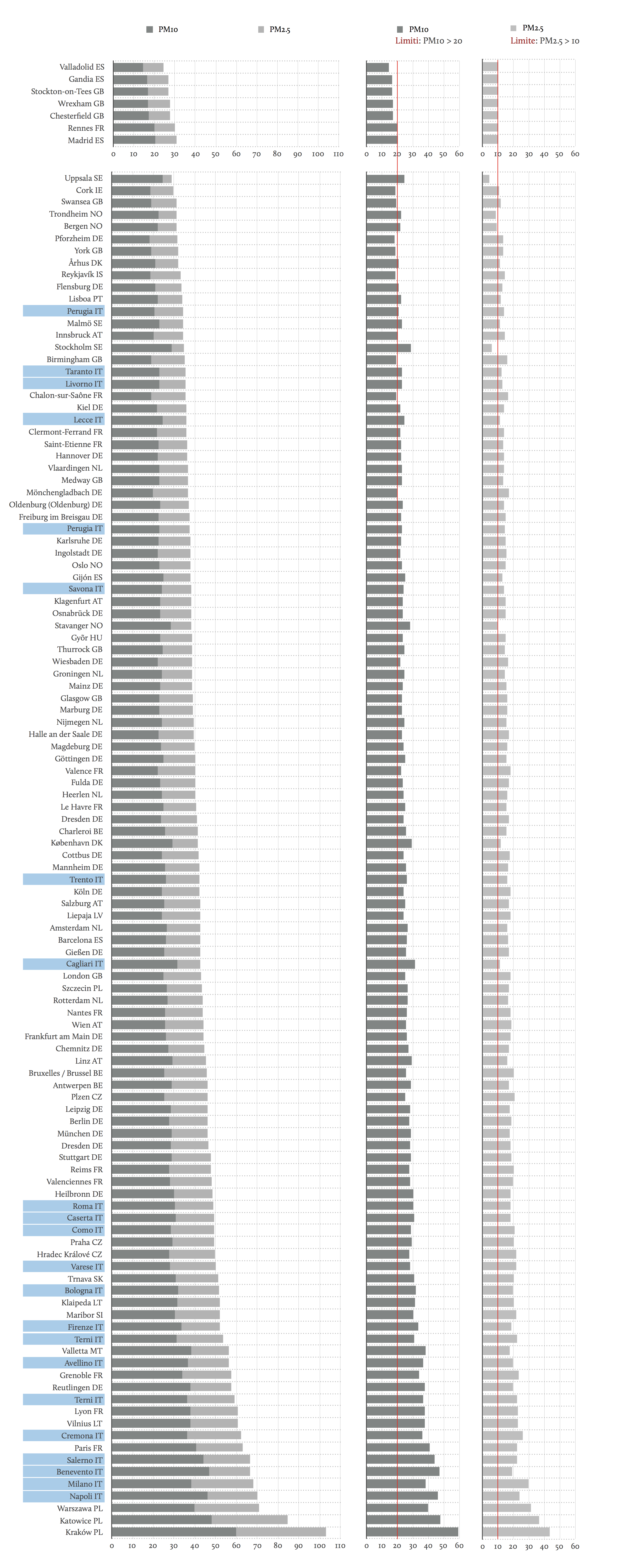 Fra le meno inquinate risultano Madrid e Gandia in Spagna, Chesterfiel e Wrexham in Inghilterra, e Rennes in Francia. La Polonia risulta il Paese con il più alto tasso d’inquinamento: Cracovia oltrepassa entrambe le soglie imposte dalle direttive europee. Delle città rimanenti l’attenzione è andata ai dati più rilevanti. Il grafico mostra come le città italiane superano ampiamente i limiti dell’OMS, con Milano in testa. Alcune città, pur presentando valori di PM10 o PM2.5 sotto i limiti della OMS, non sono state prese in considerazione poiché non avevano i dati completi. Ne sono esempi Genova e Sassari in Italia, Graz in Austria, Zurigo, Lugano e Losanna in Svizzera, Helsinki in Finlandia, Malmo in Svezia e Amburgo e Rostock in Germania.