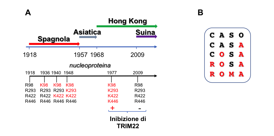 Figura 2. Un secolo di circolazione dei virus influenzali provoca il cambiamento di quattro residui di aminoacidi critici per la risposta a TRIM22. A) Quattro pandemie si sono succedute nel corso del XX e XXI secolo. Le mutazioni arginina-lisina sono indicate in ordine cronologico di comparsa. B) Analogia dell’evoluzione della nucleoproteina con un gioco della Settimana Enigmistica. Figura di Elisa Vicenzi con contributo di Eufemia Putortì.