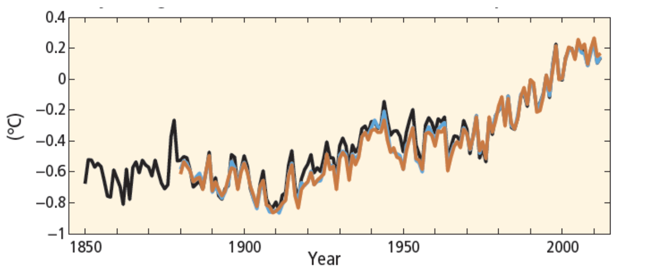 Figura 1. Andamento della temperatura media globale della Terra negli ultimi 150 anni rispetto alla media del periodo 1986-2005. I differenti colori del grafico si riferiscono a diversi set di dati utilizzati per costruire l’andamento (IPCC, 2014).