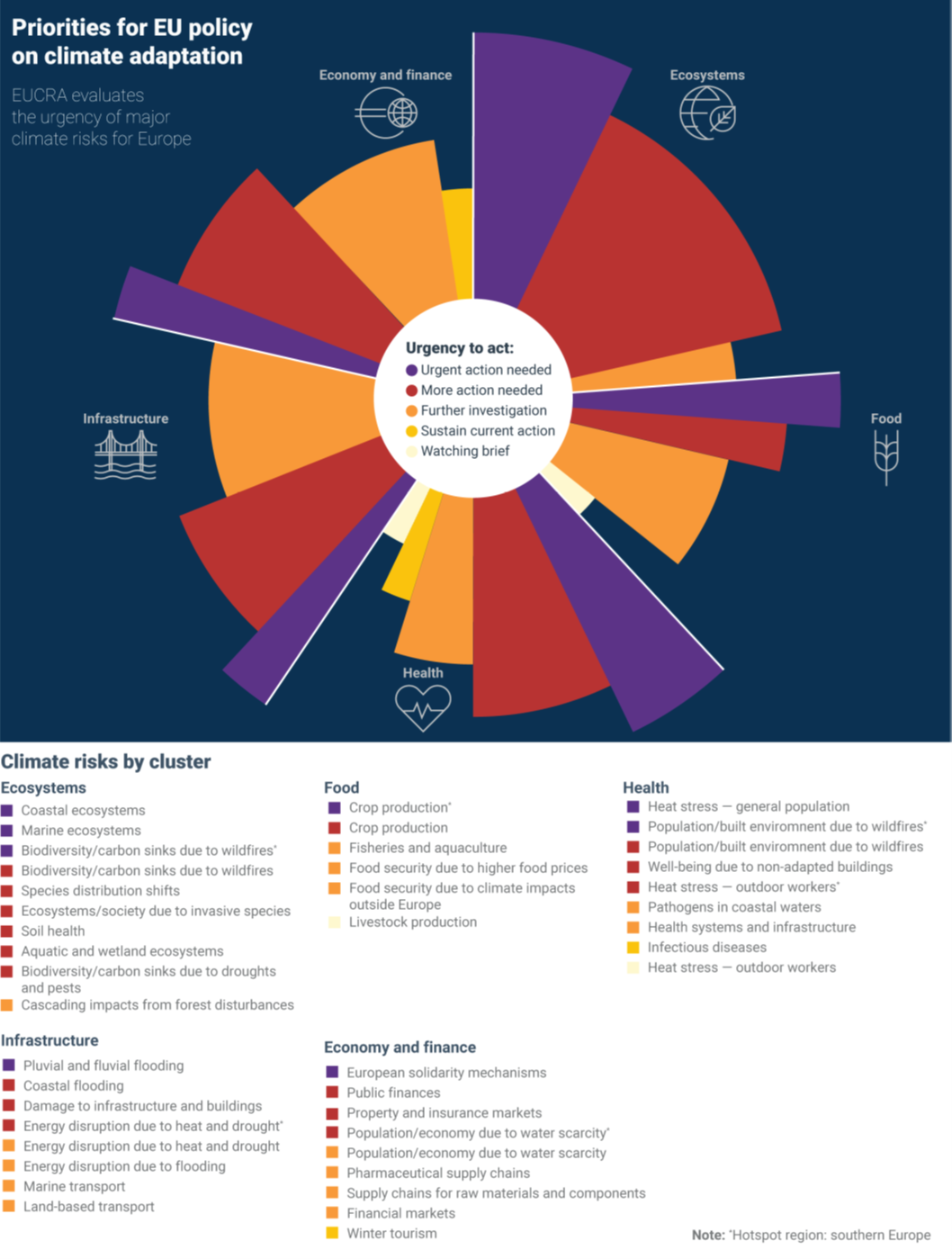 Il report ha individuato e analizzato i 36 maggiori rischi climatici per l’Europa e li ha suddivisi in 5 gruppi: ecosistemi, cibo, salute, infrastrutture ed economia e finanza. Più della metà, 21 rischi su 36, richiedono ulteriori interventi e 8 di questi rischi climatici richiedono interventi urgenti. Circa un terzo dei rischi necessita di ulteriori studi e approfondimenti o di una revisione del quadro delle politiche per la loro gestione. Tutto ciò indica che le politiche volte alla mitigazione dei rischi climatici devono aumentare in termini di ambizione, portata e attuazione.
