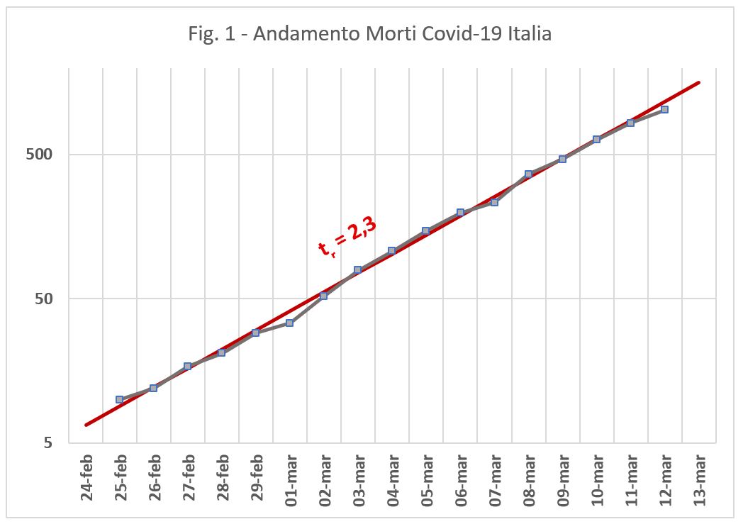 Mettendo in correlazione il valore tr = 2,3 g della curva dei decessi col valore, quantitativamente molto simile, tr = 2,1 g, della curva dei contagi nella fase iniziale dell’epidemia, lo sperato cambio di pendenza della curva dei decessi potrebbe portare nei prossimi giorni ad un rallentamento del tempo di raddoppio, con tr ~ 3,0-3,5 g.