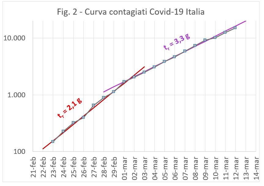 Il nostro approccio empirico ci porta ad osservare che la curva dei contagi riportata in figura 2 è inconfondibilmente spezzata in due esponenziali, il primo con tr = 2,1g e l’altro con tr = 3,3 g. La significatività e robustezza di questo dato appariranno più evidenti dal confronto con altri paesi.