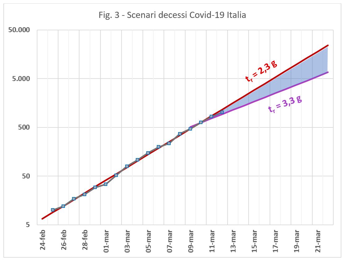 Lo spazio delle possibili evoluzioni da oggi al 20 marzo, basate sulla presente analisi, è rappresentato dal triangolo azzurro in figura 3. Lo scenario peggiore è quello in cui, a discapito di quanto previsto sopra, la curva manterrà lo stesso esponente delle ultime due settimane. Lo scenario migliore è che a partire dall’undici marzo sia iniziata una nuova fase con tempo di raddoppio tr = 3.3 g , simile alla curva dei contagi. Tale spazio di valori è visivamente illustrato dal triangolo azzurro in figura 3.