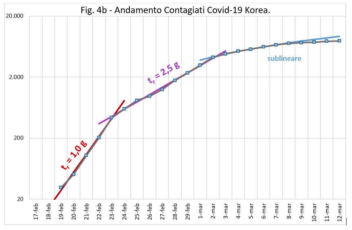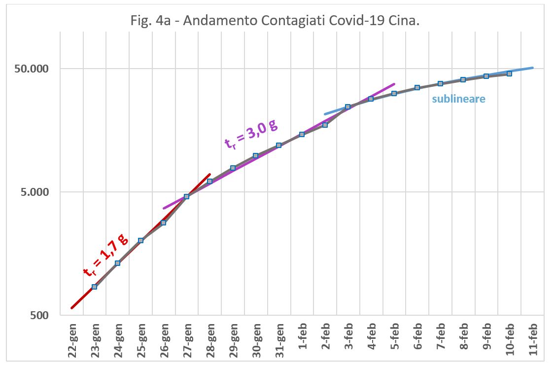 Il confronto tra gli andamenti dei casi registrati nei due paesi asiatici è messo a confronto in figura 4a e figura 4b, dove sono riportati gli andamenti temporali dei contagi totali. Nel caso dell’epidemia cinese, i cui primi numeri significativi sono stati registrati nella seconda metà di gennaio, la curva si arresta all’11 febbraio. Il 12 febbraio infatti, per un cambio di metodo di attribuzione dei casi, il numero dei casi registrati è aumentato di 15.000 unità ed (e 5.000 il giorno successivo) complicando ogni tentativo di analisi numerica delle curve. Fortunatamente l’analisi dei giorni precedenti al 12 febbraio permette già di trarre alcune indicazioni rilevanti.