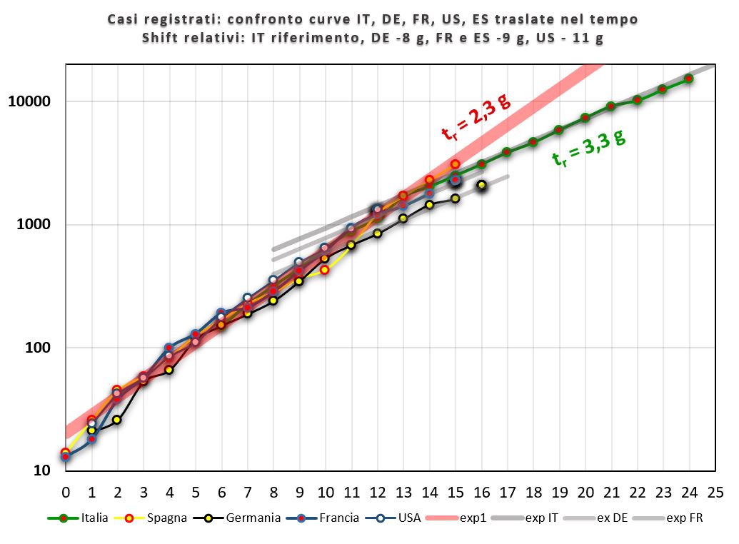 Riportiamo in figura 5 l’andamento dei dati registrati di Germania [7], Francia [8], Spagna [9], Stati Uniti [10]. Tra i vari modi di accostare i dati nello stesso grafico, quello di gran lunga più significativo è di traslare temporalmente i dati dei diversi paesi, in modo tale da portare alla migliore possibile sovrapposizione le curve relative alla fase iniziale dell’epidemia. La traslazione ottenuta, rispetto ai giorni di calendario, e mantenendo come riferimento l’Italia, è pari a -8 giorni per Germania, -9 giorni per Spagna e Francia e -11 giorni per USA. Tolti i dati dei primi giorni, fortemente irregolari perché minimi nei valori e raccolti in una fase in cui i sistemi sanitari erano impreparati ad una rivelazione sistematica, tutti e cinque i paesi hanno vissuto o stanno vivendo una fase di sviluppo del contagio con tempi di raddoppio dell’ordine dei due giorni.