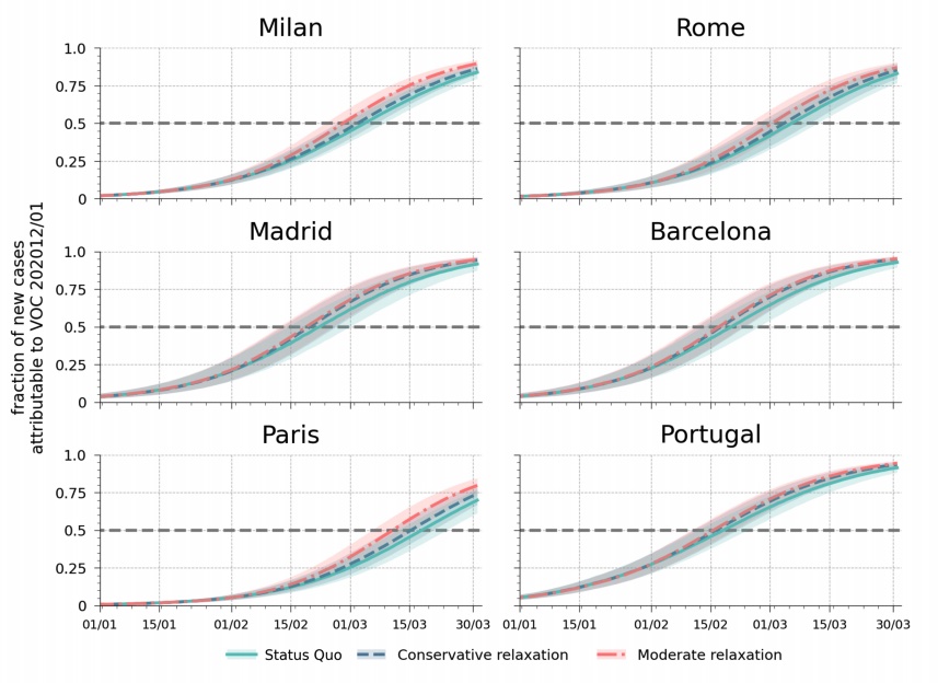 Questo è lo scenario più probabile secondo un lavoro pubblicato la scorsa settimana dal gruppo di epidemiologi computazionali coordinati da Alessandro Vespignani della Northeastern University di Boston. Vespignani e colleghi stimano che la variante B.1.1.7 sarebbe dominante entro marzo nelle aree metropolitane di Parigi, Madrid, Barcellona, Milano e Roma, assumendo che sia il 50% più contagiosa di quella storica.