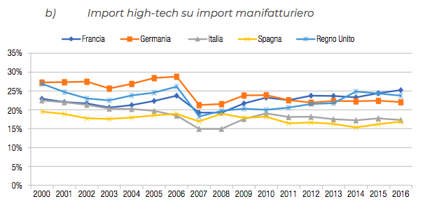 Quota percentuale dei prodotti hi-tech sugli scambi commerciali manufatturieri nei maggiori Paesi europei, anni 2002-2016. Fonte: elaborazione ENEA-Osservatorio sull'Italia nella Competizione Tecnologica Internazionale su dati OECD-ITCS Database. Dal report Relazione sulla ricerca e l’innovazione in Italia
