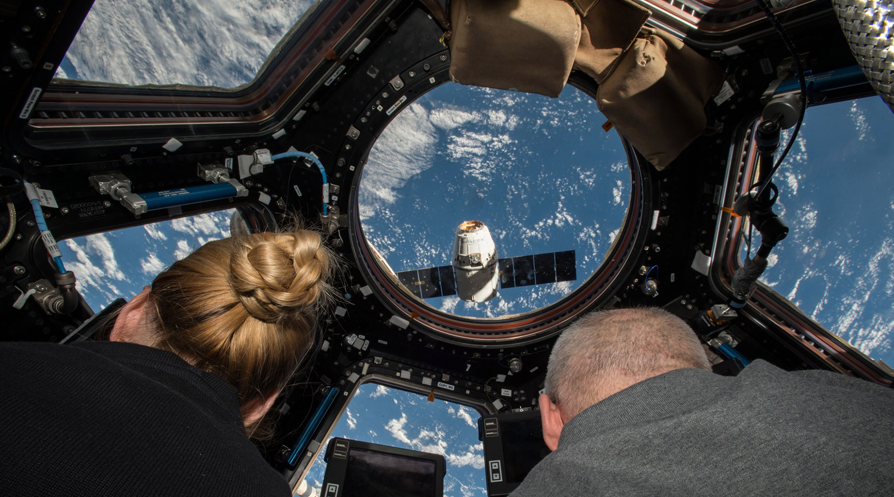Gli astronauti Kate Rubins (a sinistra) e Jeff Williams (a destra) osservano dalla cupola della Stazione spaziale l’arrivo di una navetta SpaceX Dragon con i rifornimenti. Sullo sfondo si nota la rassicurante immagine della Terra, un elemento che contribuisce a rendere meno pesante (e stressante) la lontananza da casa imposta dalle lunghe missioni sulla ISS. Elemento sul quale gli equipaggi in rotta verso Marte non potranno certo contare. Credits: NASA.