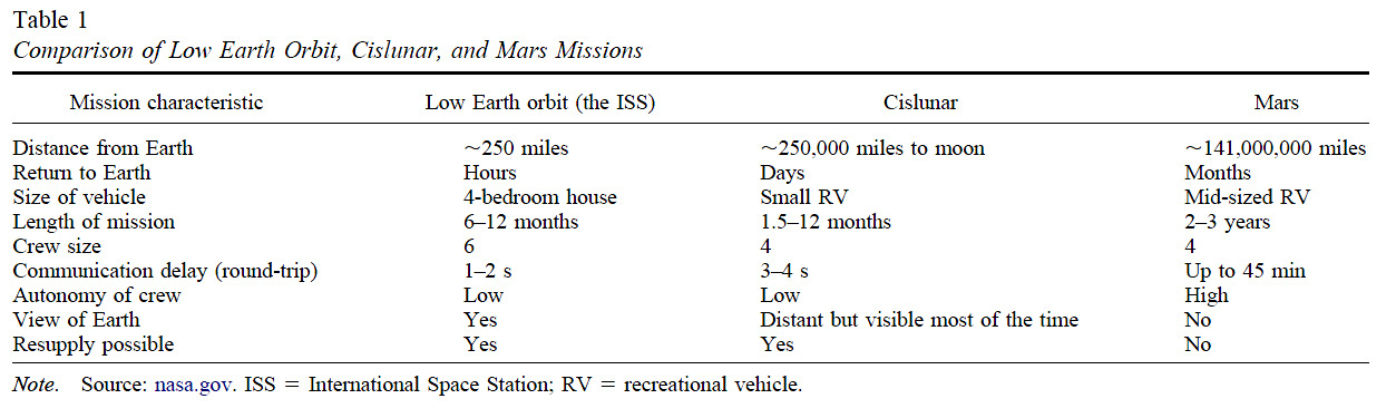 La tabella, contenuta nello studio citato, confronta le caratteristiche salienti di tre differenti tipologie di missione spaziale. Alcune differenze tra le missioni sulla ISS (o le missioni cislunari) e quelle verso Marte meritano particolare attenzione per le inevitabili ricadute psicologiche. Le più evidenti sono, ovviamente, la durata della missione e lo spazio a disposizione dell’equipaggio, ma altrettanto critiche potrebbero rivelarsi il poter contare o meno su missioni di soccorso, l’enorme grado di autonomia richiesto all’equipaggio e il ritardo nelle comunicazioni.
