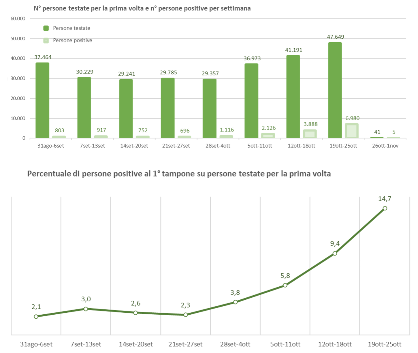 Sono fornite dalla proporzione dei primi tamponi positivi sul totale di tutti coloro che hanno fatto almeno un tampone. ECDC presenta i dati dei Paesi in UE usando la soglia del 4% per la proporzione di positivi. Con gli attuali livelli di incidenza proporzioni superiori al 10-12% sono considerate indicative di una bassa sensibilità del sistema.