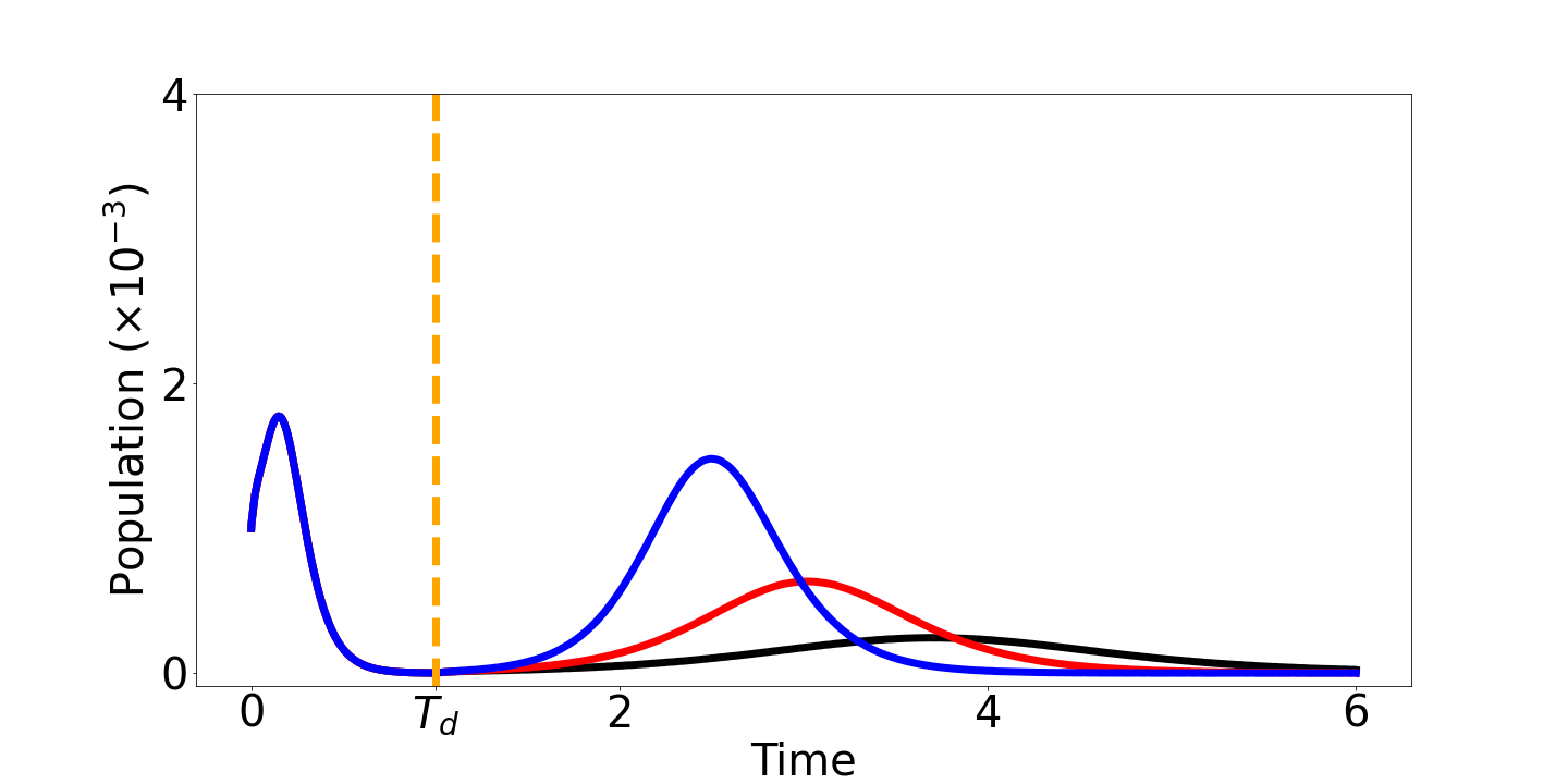 La figura 2 indica il risultato delle simulazioni sulla dinamica degli infetti per un virus con livello di aggressività fisso, considerando diversi livelli di distanziamento a seguito della riduzione del livello di distanziamento dopo la prima onda. In particolare una mancanza di controllo di tale livello può condurre a una seconda onda con numero di nuovi contagi superiore alla prima, come indicato nelle simulazioni con i colori blu, rosso e nero. Imponendo azioni di distanziamento più restrittive, la seconda onda presenta livelli di contagio inferiori a quelli della prima onda.