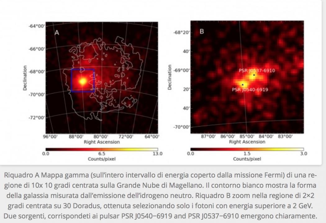 Selezionando solo gli eventi di energia superiore a 2 GeV, dove la risoluzione angolare dello strumento è al suo massimo, è stato possibile vedere che la macchia di 30 Doradus contiene due belle sorgenti puntiformi le cui posizioni coincidono con PSR J0540-6919 e PSR J0537-6910.