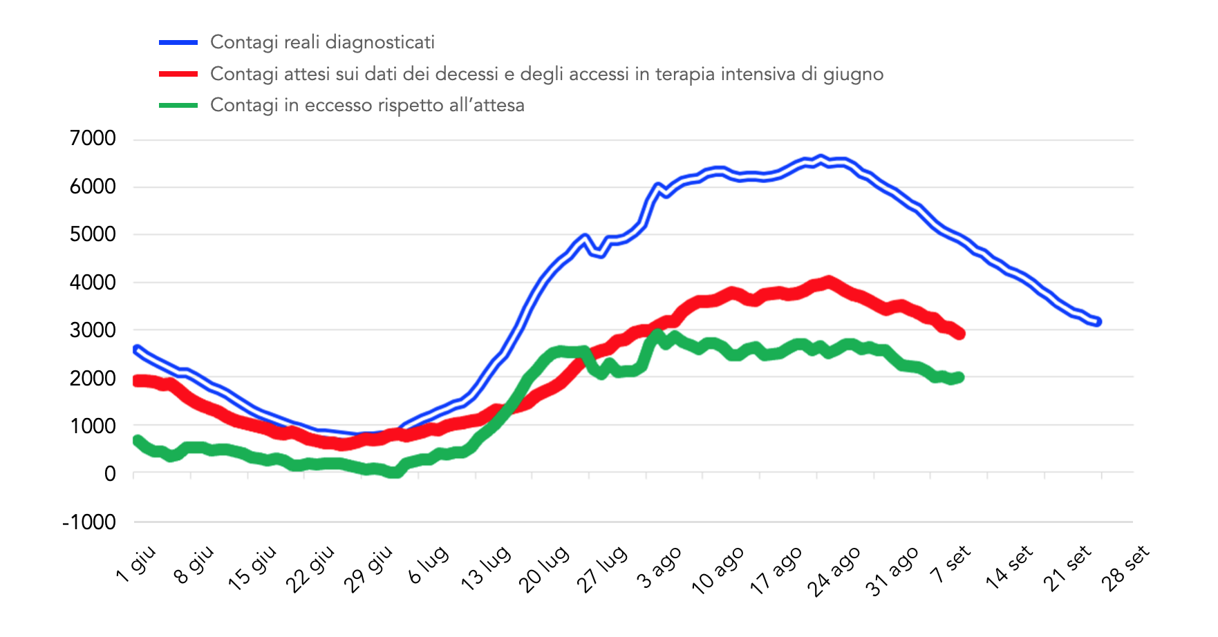 Questa differenza potrebbe essere attribuita ai contagi tra i vaccinati, facendo l’assunzione che nessuno tra questi abbia avuto bisogno di ricovero intensivo né sia andato incontro alla morte. La decrescita dei contagi iniziata a metà agosto sarebbe allora spiegata dalla crescita della percentuale dei vaccinati nella popolazione generale.