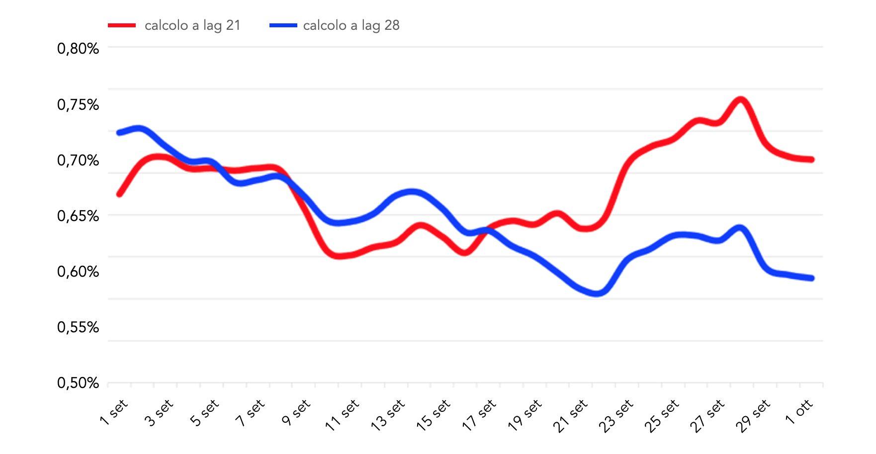 Calcolando delle frequenze standardizzate delle medie mobili settimanali, il trend dei decessi appare in questa fase simile al trend dei contagi ma traslato in avanti tra i 21 e i 28 giorni. È allora possibile ipotizzare che la letalità sia il rapporto tra la frequenza di decessi e la frequenza di contagi diagnosticati tra i 21 e i 28 giorni precedenti. Il risultato dà una tendenza in diminuzione se si sceglie un tempo di latenza di 28 giorni, e invece una tendenza invece piatta se il tempo di latenza è di 21 giorni.