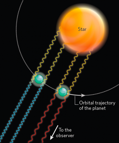 Studiando le righe di assorbimento durante le fasi di avvicinamento e di allontanamento del pianeta (effetto Doppler), gli autori hanno notato uno spostamento della frequenza delle righe molecolari (figura 2), così come avviene con il fischio del treno percepito dal nostro orecchio quando questo ci passa accanto ad alta velocità, sentiamo un suono cambia di frequenza. Con questa tecnica è stato, quindi, possibile misurare la velocità di transito del pianeta (140 km al secondo) attorno alla stella, la sua massa (circa 2/3 la massa di Giove) ma anche le molecole presenti nell’atmosfera planetaria. Gli autori hanno rivelato, chiaramente, la presenza di CO ma non di acqua o metano. Un risultato certamente interessante.