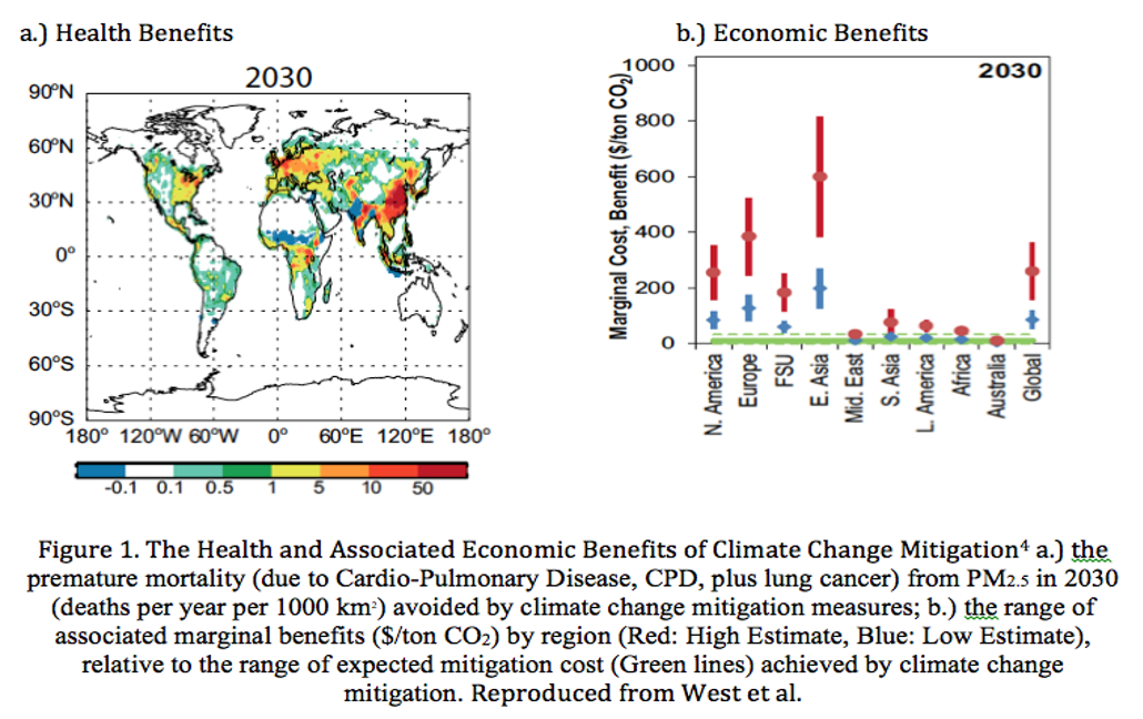 Figura 5 - Un esempio di come benefici per la salute e benefici economici possono associarsi in una politica di mitigazione del cambiamento climatico (CC): a sinistra morti evitate attraverso una riduzione degli inquinanti atmosferici (PM2.5) legata a interventi di mitigazione del CC; a destra stime dei benefici economici associati alla mitigazione del CC (in blu le stime più conservative, in rosso quelle più ottimistiche; in verde i costi dalla mitigazione) (fonte West et al, 2013)